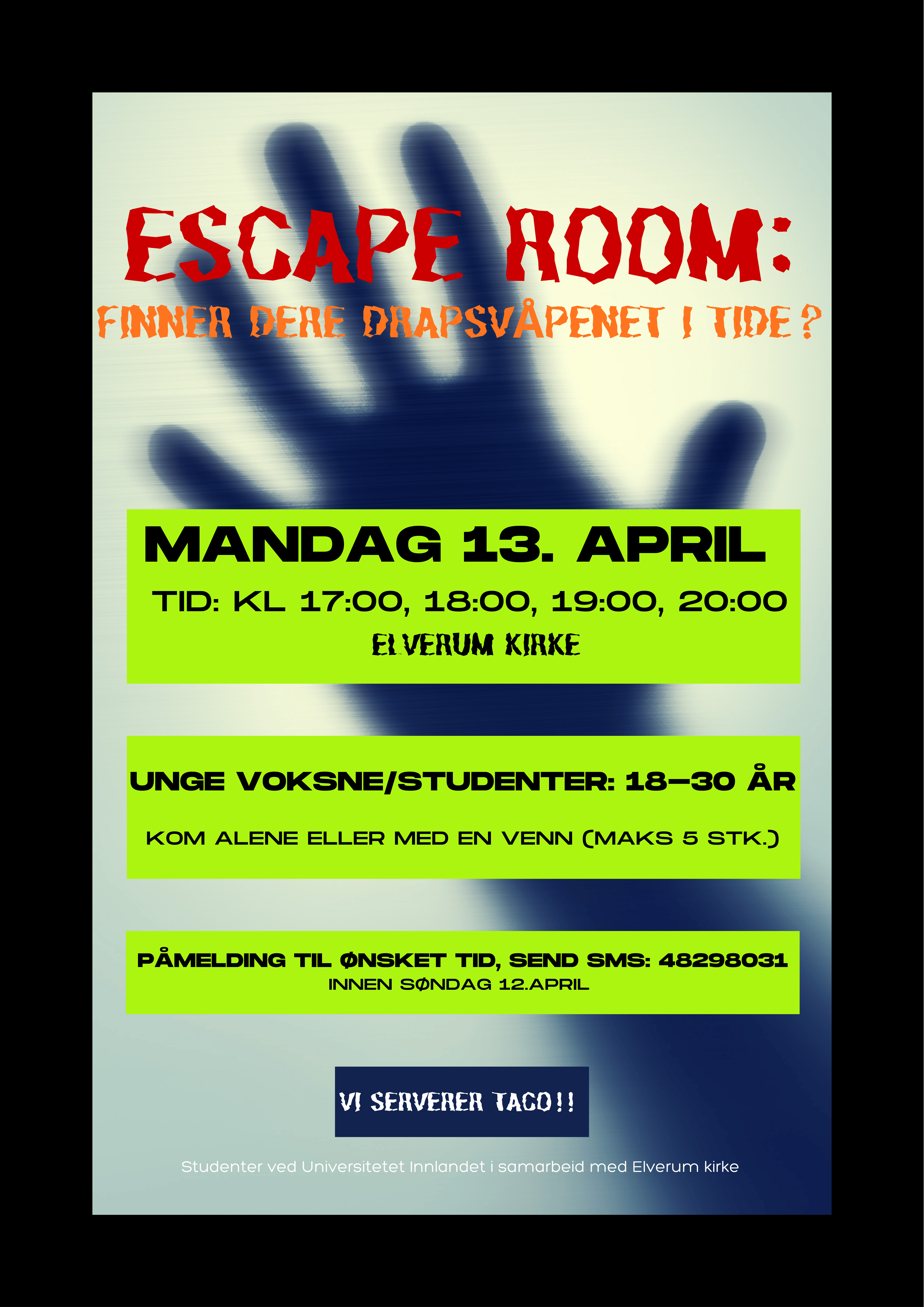 Spenning og taco mandag 13. april i Elverum kirke for unge voksne og studenter.
