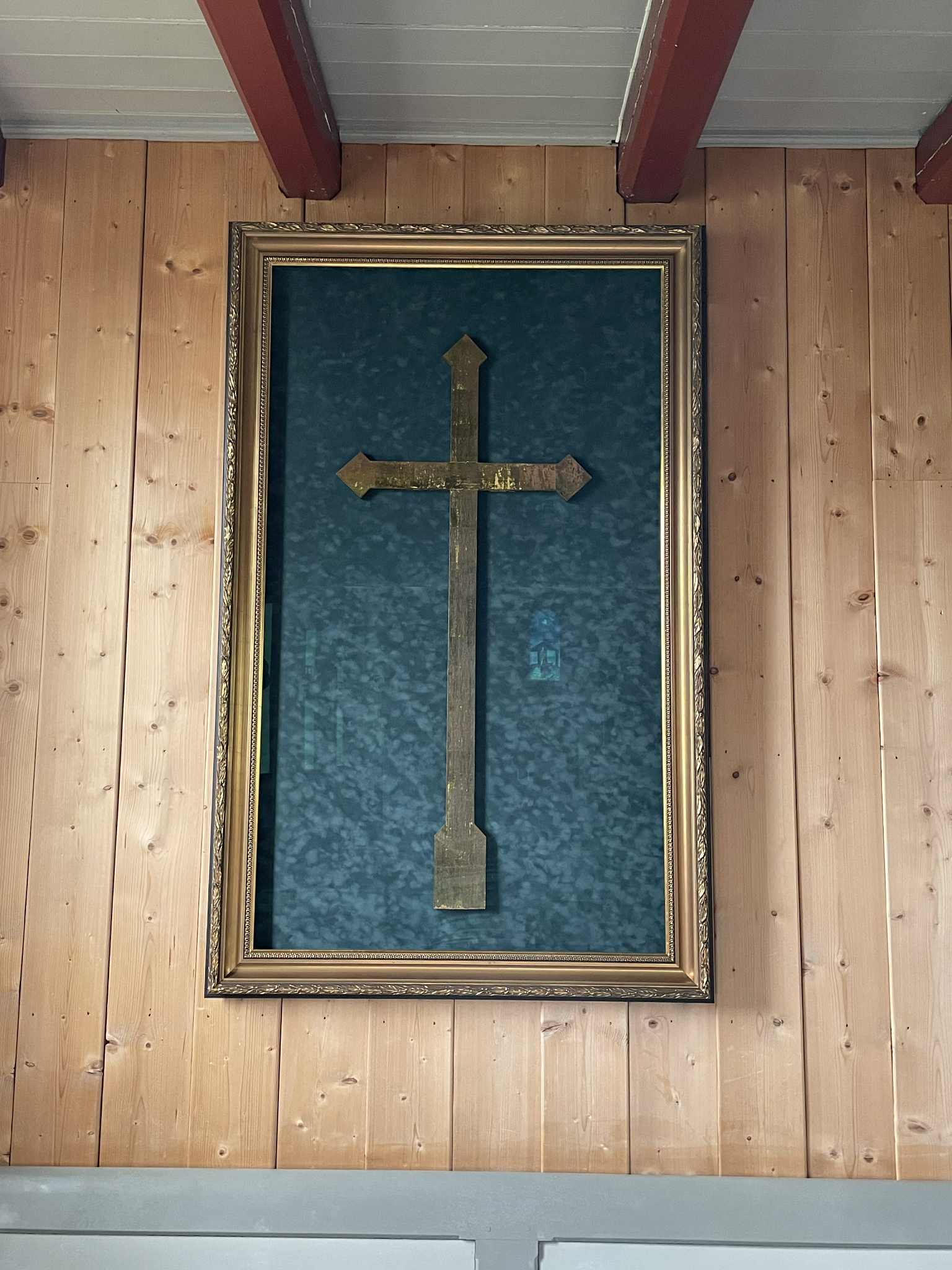 Avdukingen skjedde som en del av inngangsprosesjonen. Trekorset ble funnet i kirketårnet i fjor. Som altertavle var korset forgylt på mørkegrønn bakgrunn. Også Nordskogbygda kirke har hatt et tilsvarende kors.