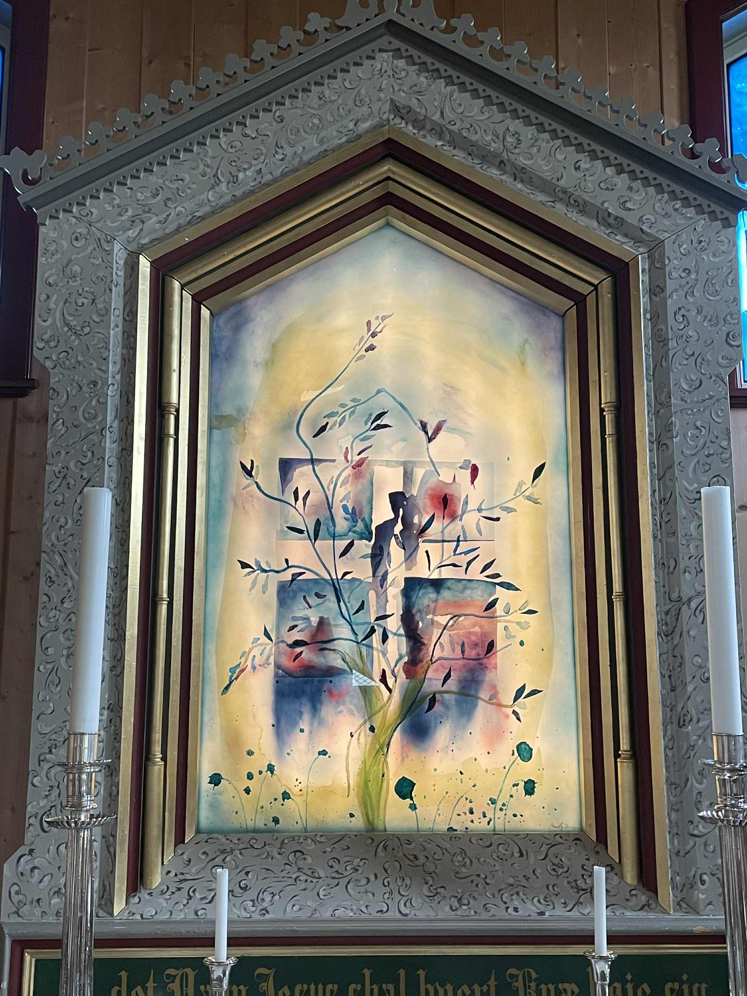 De tre altertavlene som har smykket Sørskogbygda kirke, kan nå betraktes i kirkerommet. Kontinuiteten fra da kirken var ny, er dermed bevart. Altertavla med korset henger til høyre for inngangsdøra under orgelgalleriet, mens Sæthers maleri henger på andre siden av døra. Trekorset er konservert ved Anno museum, Elverum. Innrammingen er utført av Tunet rammeverksted.