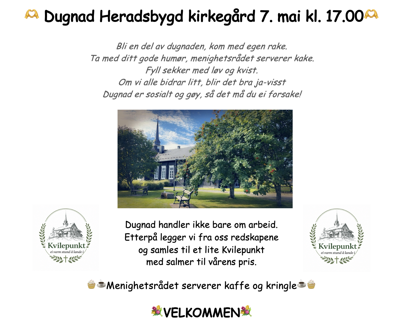 Etter dugnaden samles vi til Kvilepunkt med salmer til vårens pris, kaffe og kake!